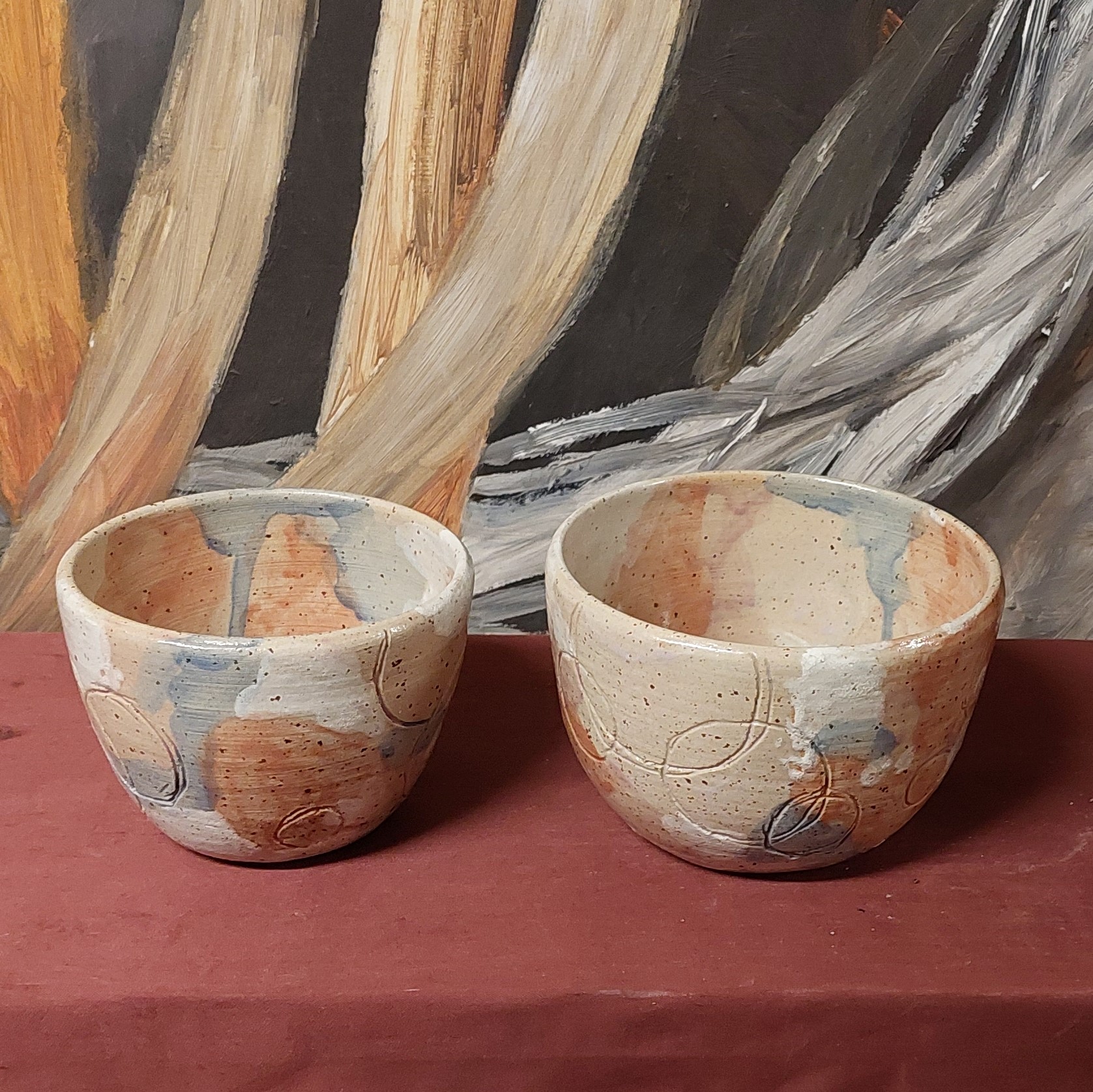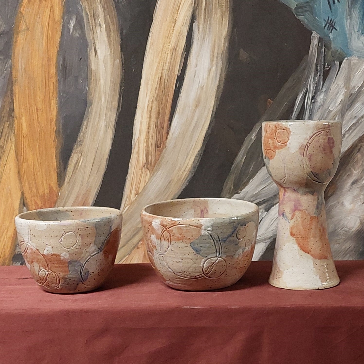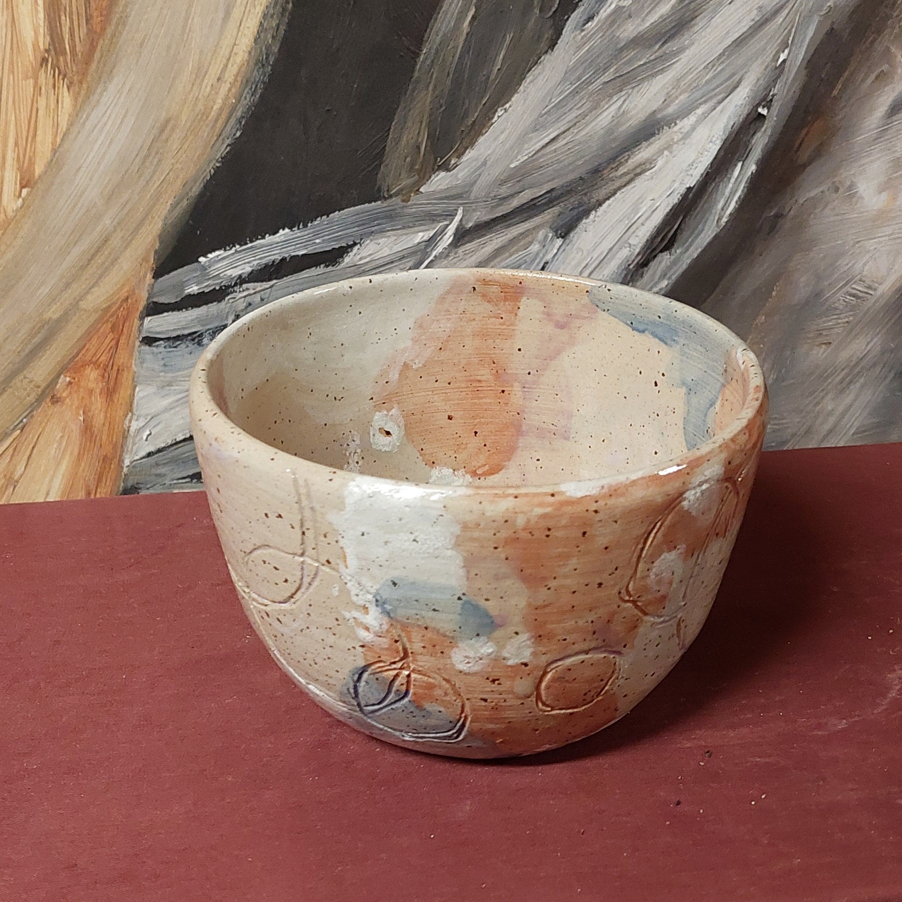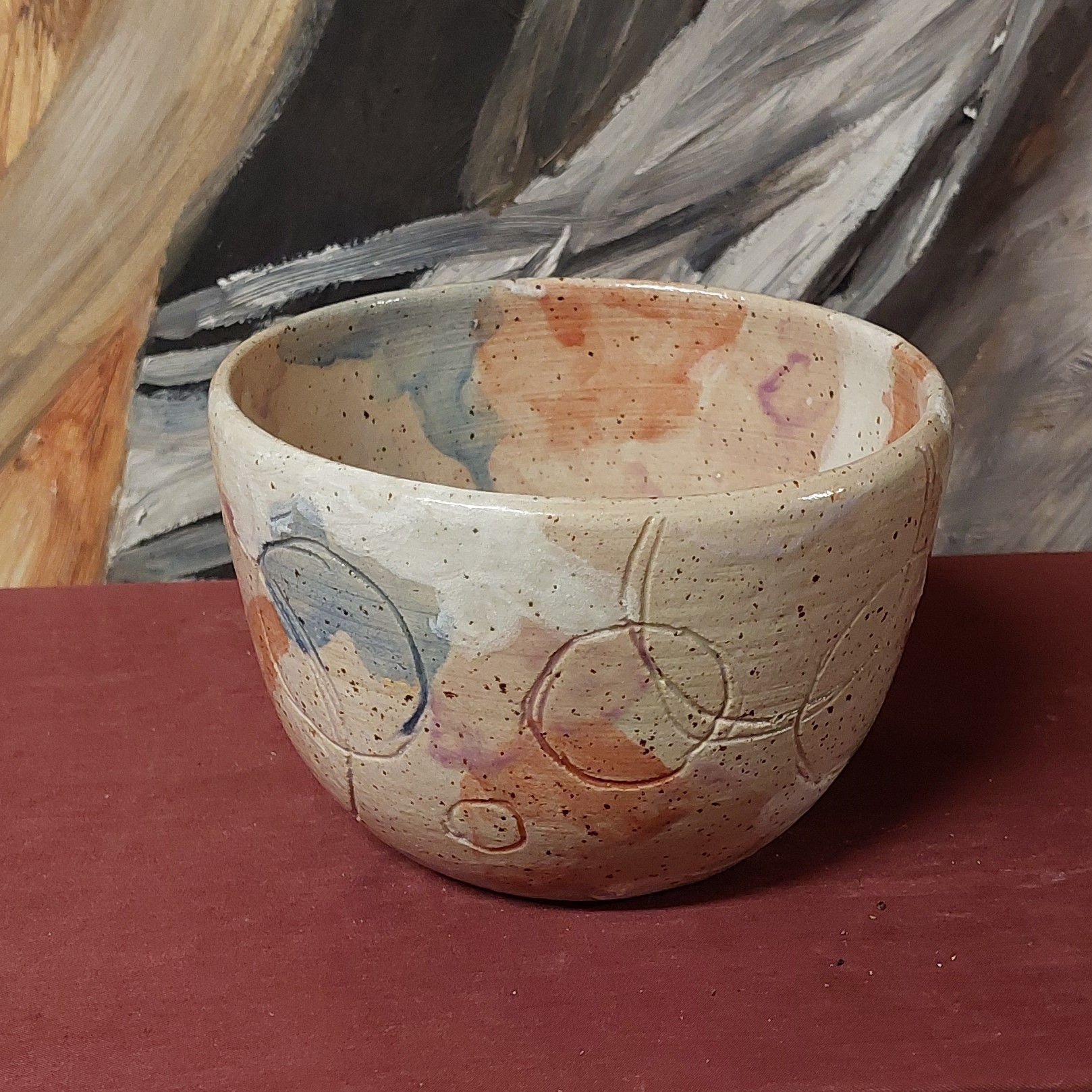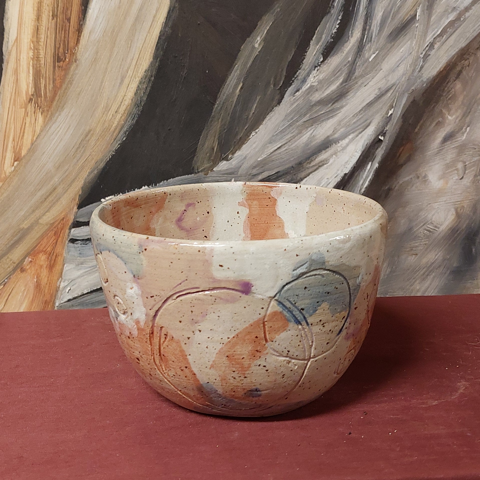 Laihoja erivärisiä alilasitteita alla jonka päällä kiiltävä läpinäkyvä lasite, tarkoituksena tuoda hattaramainen ilme. Ulkopuolella raaputettuja ympyräkuvioita.