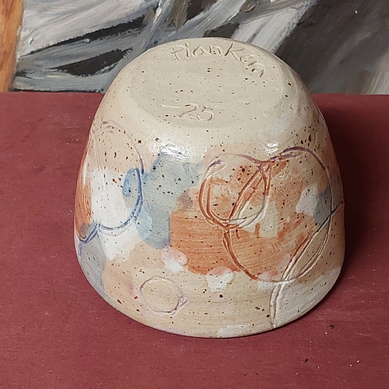 Laihoja erivärisiä alilasitteita alla jonka päällä kiiltävä läpinäkyvä lasite, tarkoituksena tuoda hattaramainen ilme. Ulkopuolella raaputettuja ympyräkuvioita.