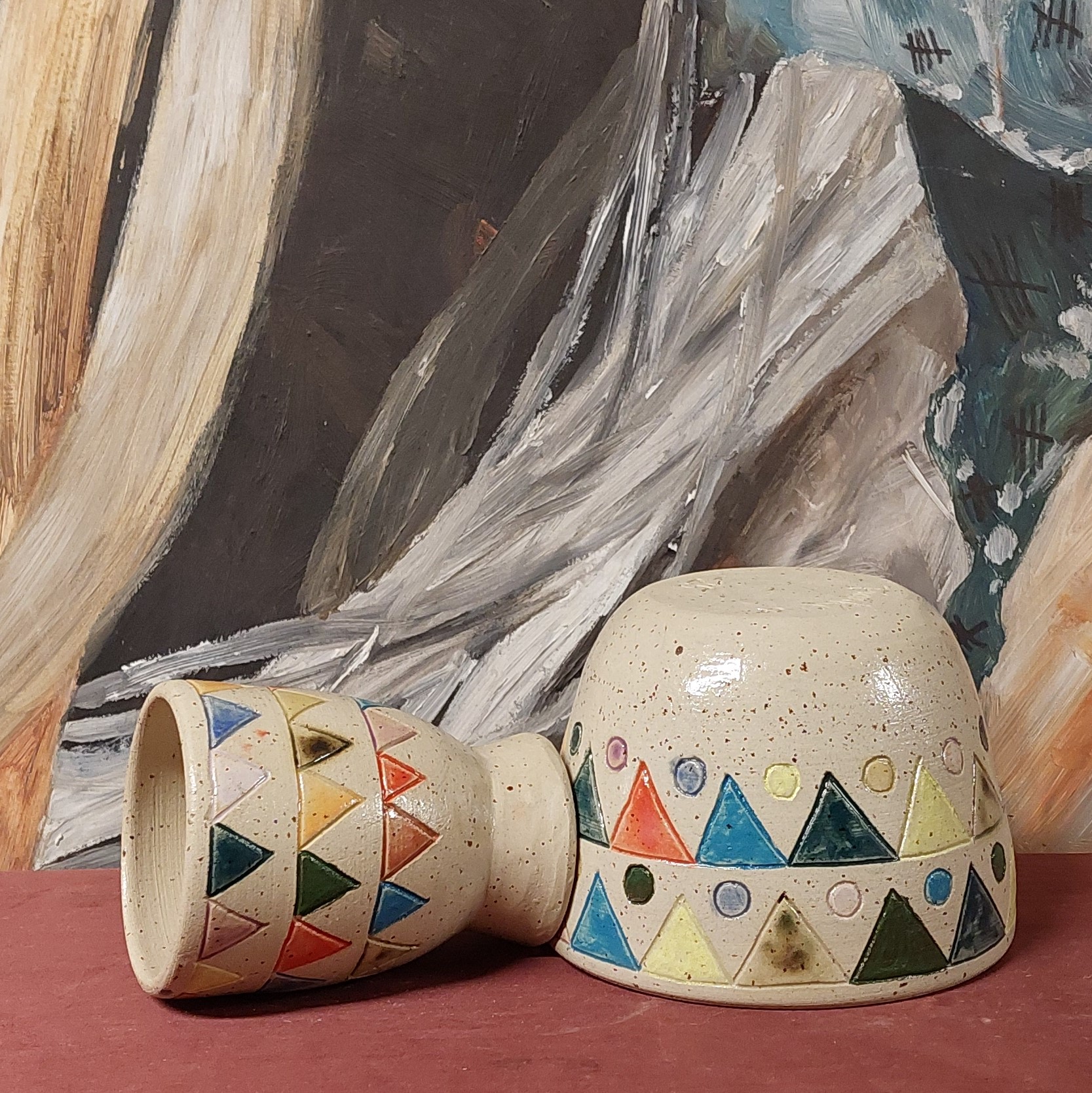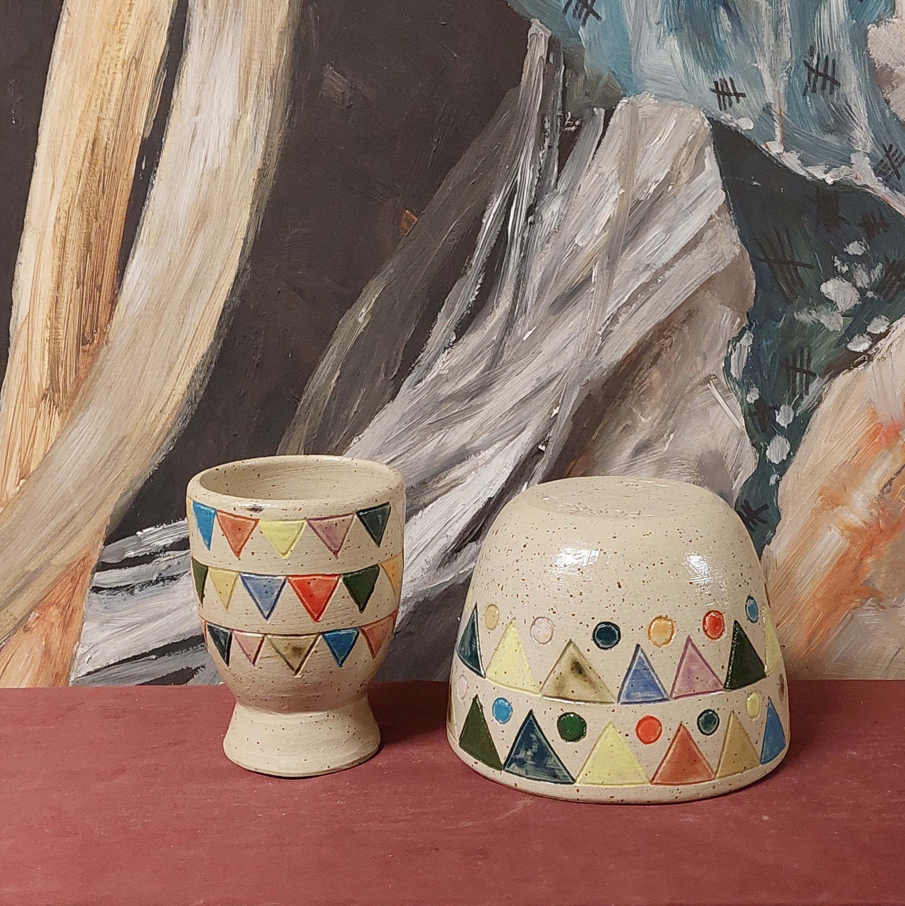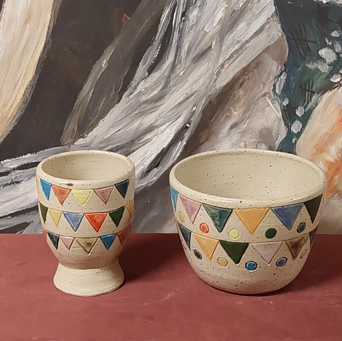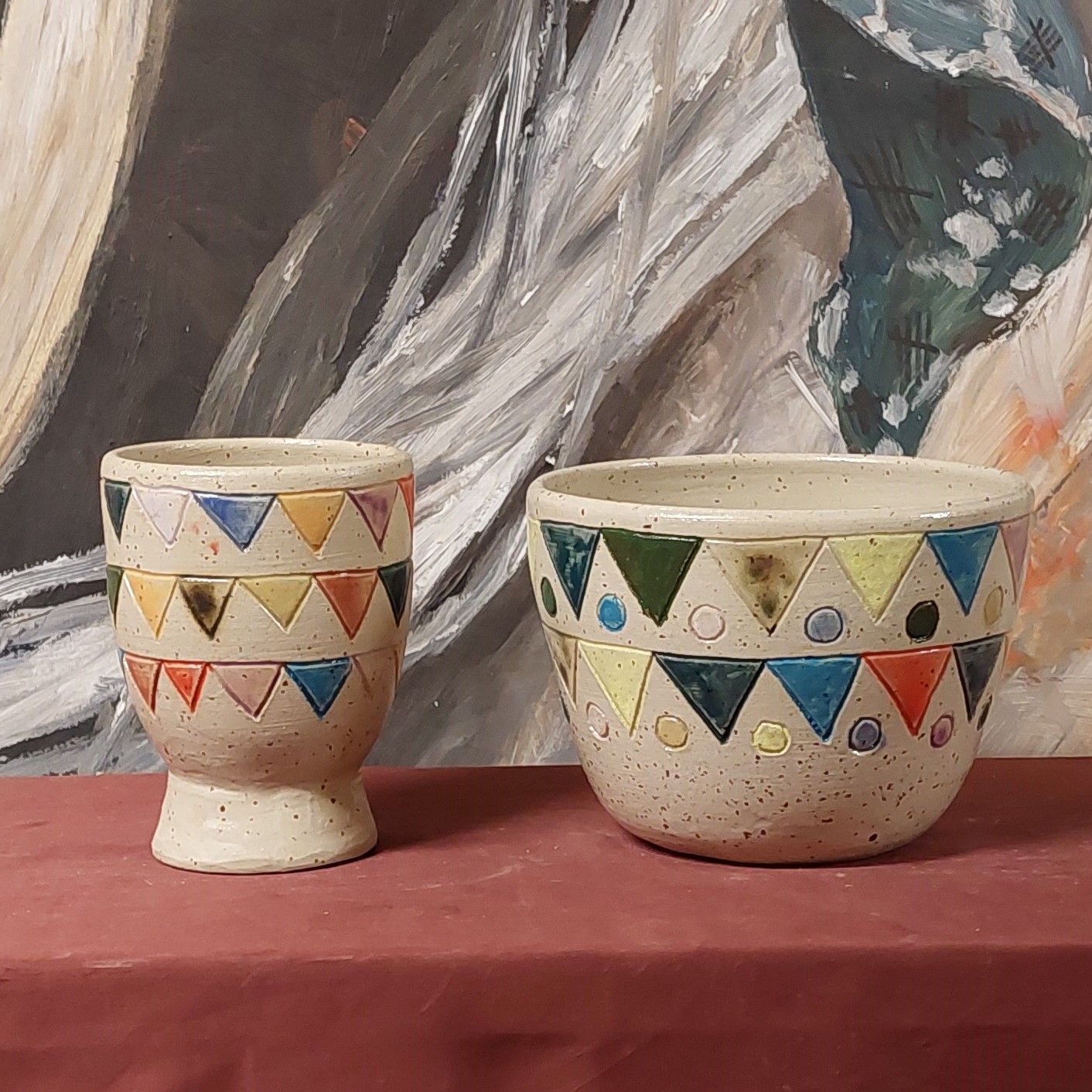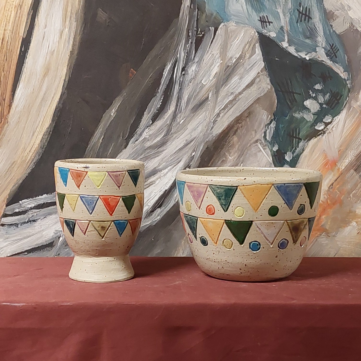 Kuppi ja kulho samalla teemalla. Kuviot on maalattu alilasitevärein ja päällä on läpinäkyvä lasite. Astiat ovat elintarvikekelpoisia ja ne voi pestä astianpesukoneessa. Astiat on dreijattu laavapilkullisesta korkeanpolton savesta ja poltettu 1220 asteessa.