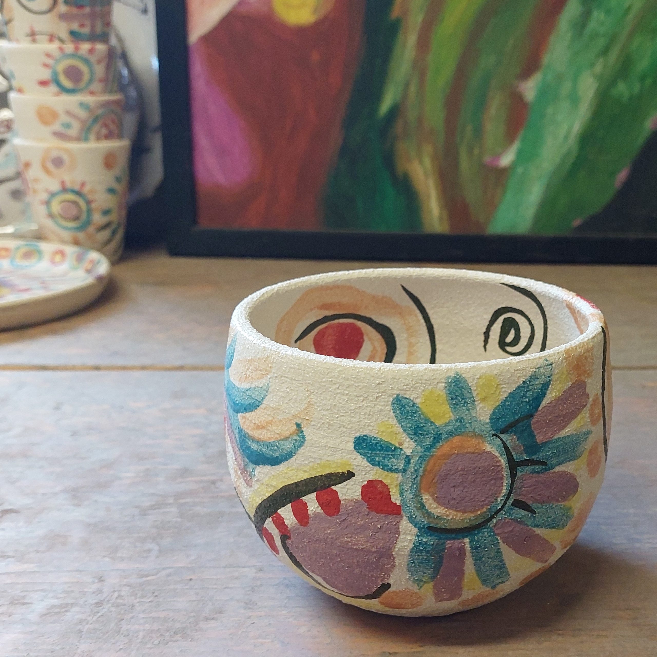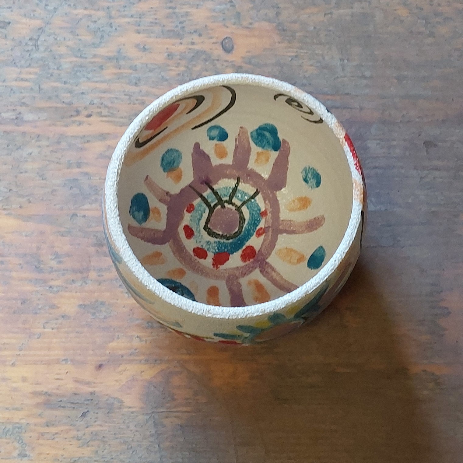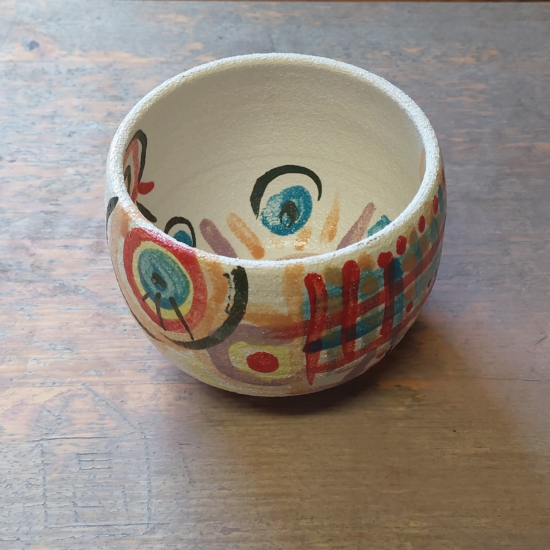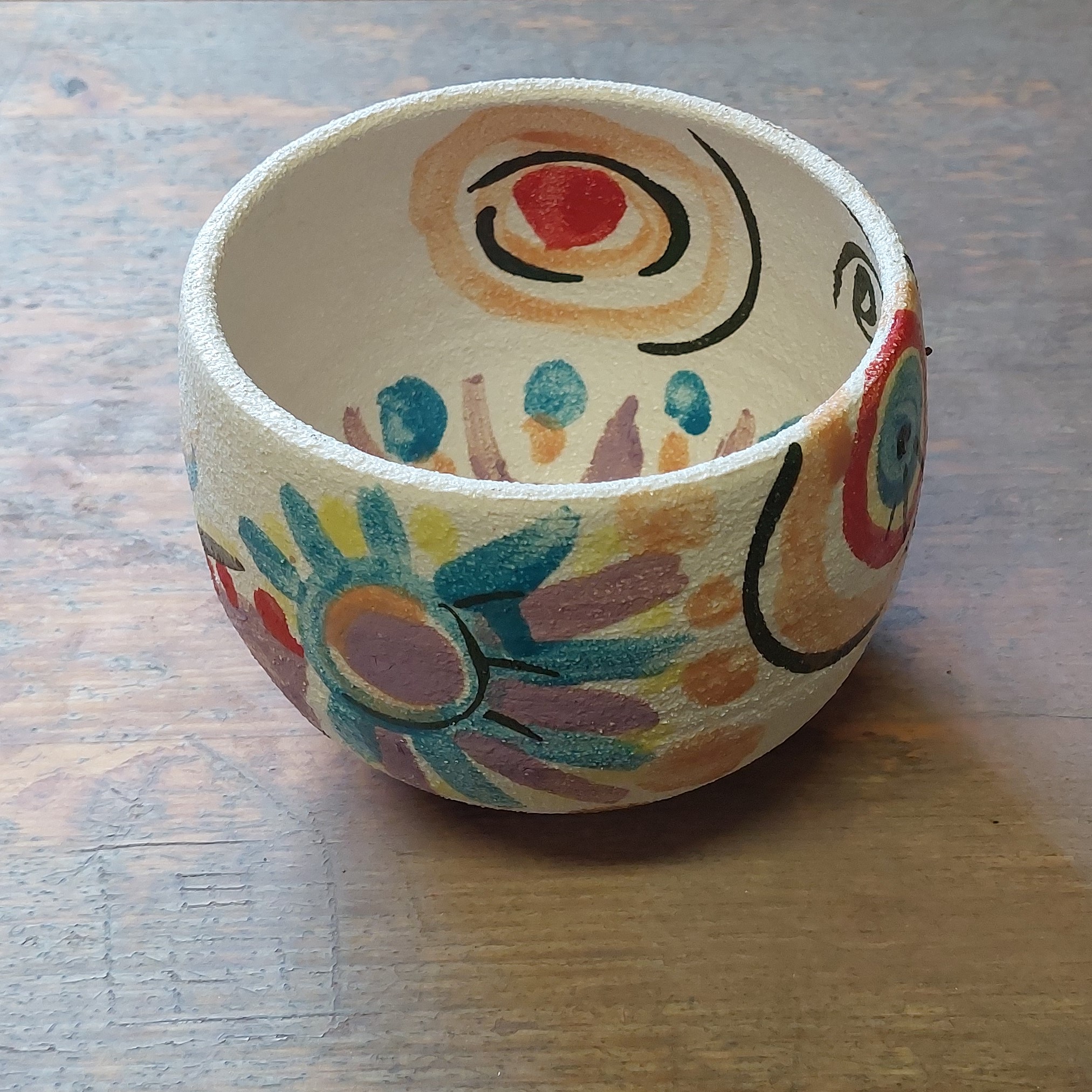 Vaalea dreijattu kulho värikkäillä maalauksilla.